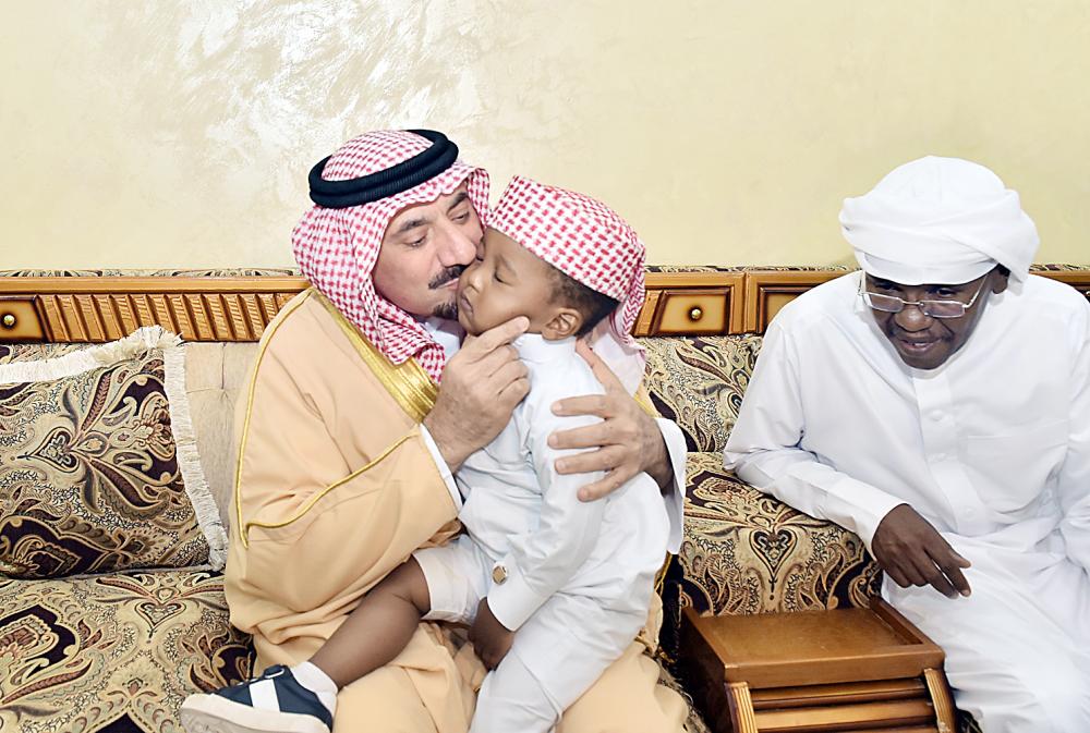 الأمير جلوي بن عبدالعزيز يقبل أحد أبناء الشهيد.