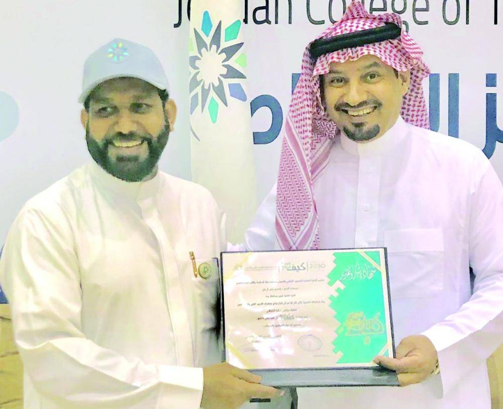 كرم مدير عام التدريب التقني والمهني بمنطقة مكة المكرمة فيصل كدسة، مدير إدارة التوجيه والإرشاد بالكلية التقنية بجدة ومشرف برنامج التكامل المهني باسم بن يحيى آل جلي، بشهادة شكر وتقدير، لمشاركته الفاعلة والمتميزة ضمن مبادرات ملتقى مكة الثقافي «كيف نكون قدوة؟».