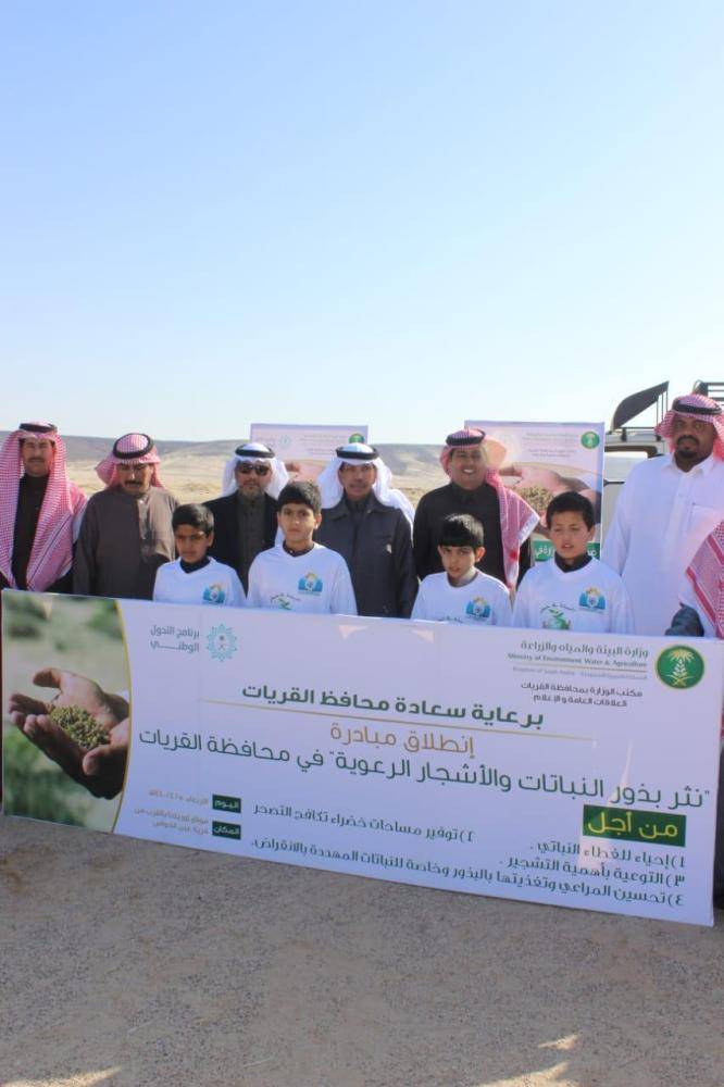 وحضر إطلاق المُبادرة مدير فرع خدمات المياه بمحافظة القريات عبدالعزيز السمحان وَ بمشاركة كلاً من إدارة التعليم بالقريات من خلال مجموعة من طلبة المدارس وَ فريق غوث المُساند التطوعي وَجمعية القريات الخضراء، كما تعاون في تنفيذ الفعالية مركز إكثار البذور التابع لمركز أبحاث المراعي بالجوف من خلال تأمين كمية من البذور لهذه المناسبة.