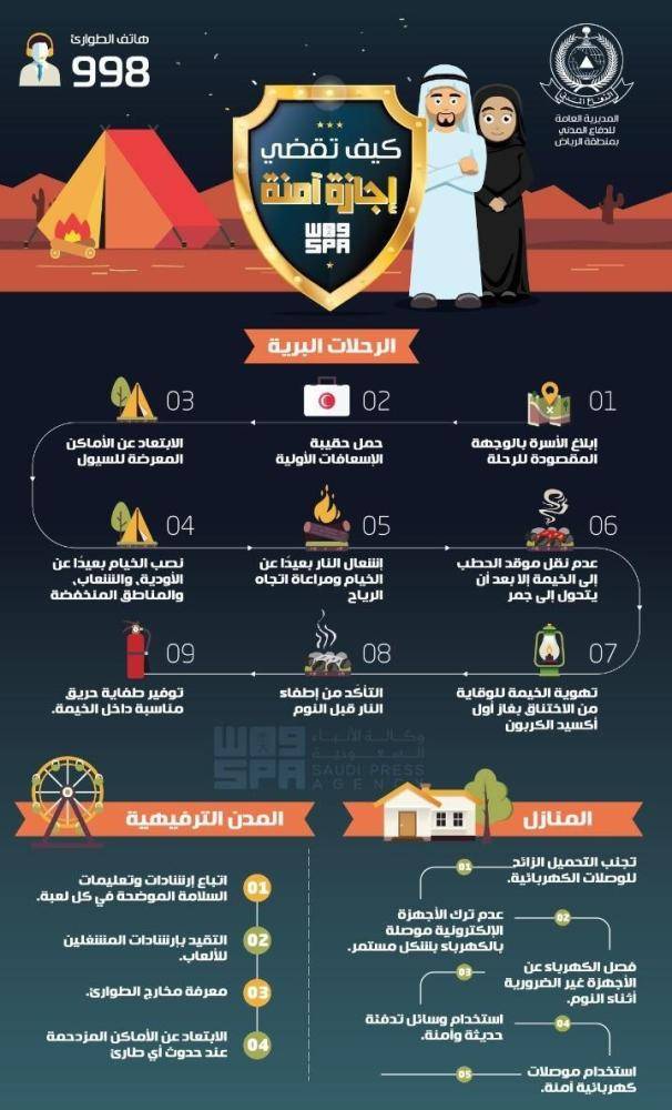 دعا الدفاع المدني بمنطقة الرياض، الجميع إلى الأخذ بوسائل وتعليمات السلامة، أثناء الاستمتاع بإجازة منتصف العام الدراسي، كما نبه إلى اختيار المكان المناسب عند نصب الخيام خلال التنزه في الأماكن البرية، بعيداً عن مخاطر الأودية، والحرص على إشعال النار بعيداً عن الخيام وباستخدام وسائل إشعال آمنة، ومراعاة اتجاه الرياح وعدم نقل موقد الحطب إلى داخل الخيمة، إلا بعد أن يتحول إلى جمر، وضرورة تهوية الخيمة، للوقاية من الاختناق، بغاز أول أكسيد الكربون، وإشعال النار بالوسائل الآمنة وينبغي التأكد من إطفاء النار قبل النوم، وتوفر طفاية حريق مناسبة داخل الخيمة أو بالسيارة.