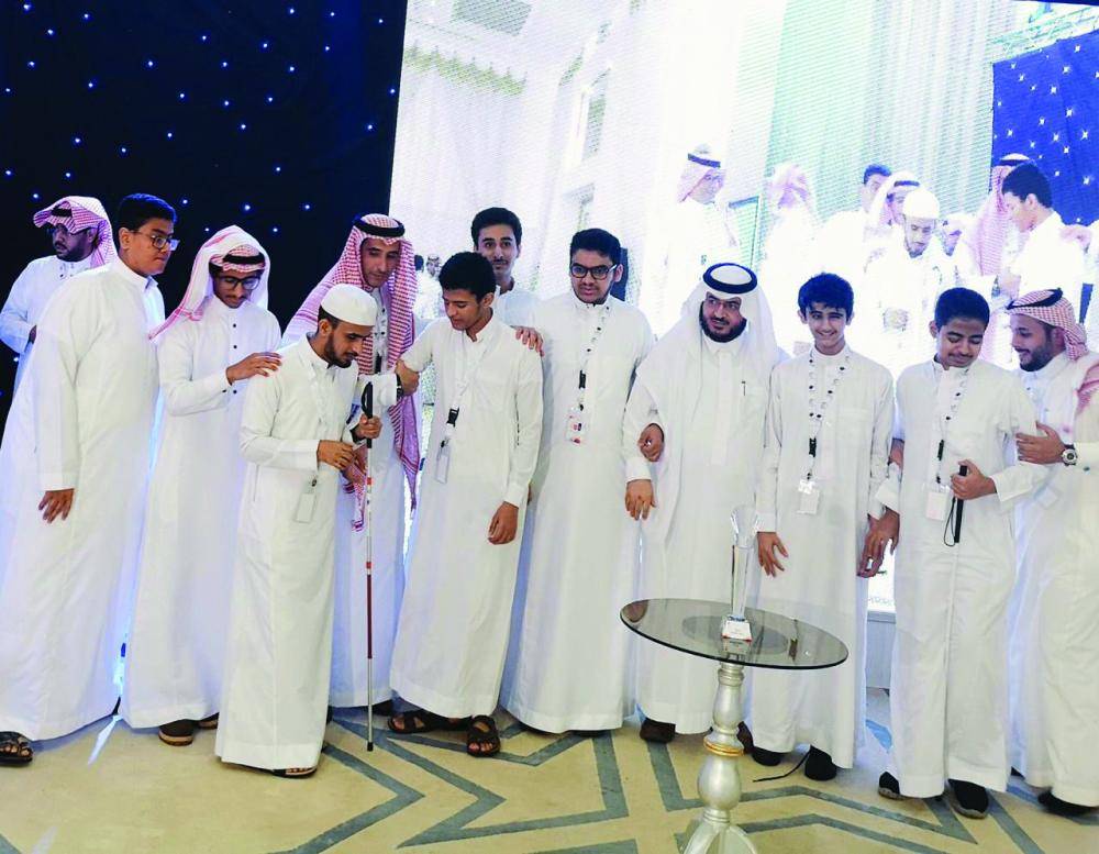 القحطاني والشهري يتوسطان الطلاب المشاركين في المسابقة. (تصوير: فيصل الحارثي)
