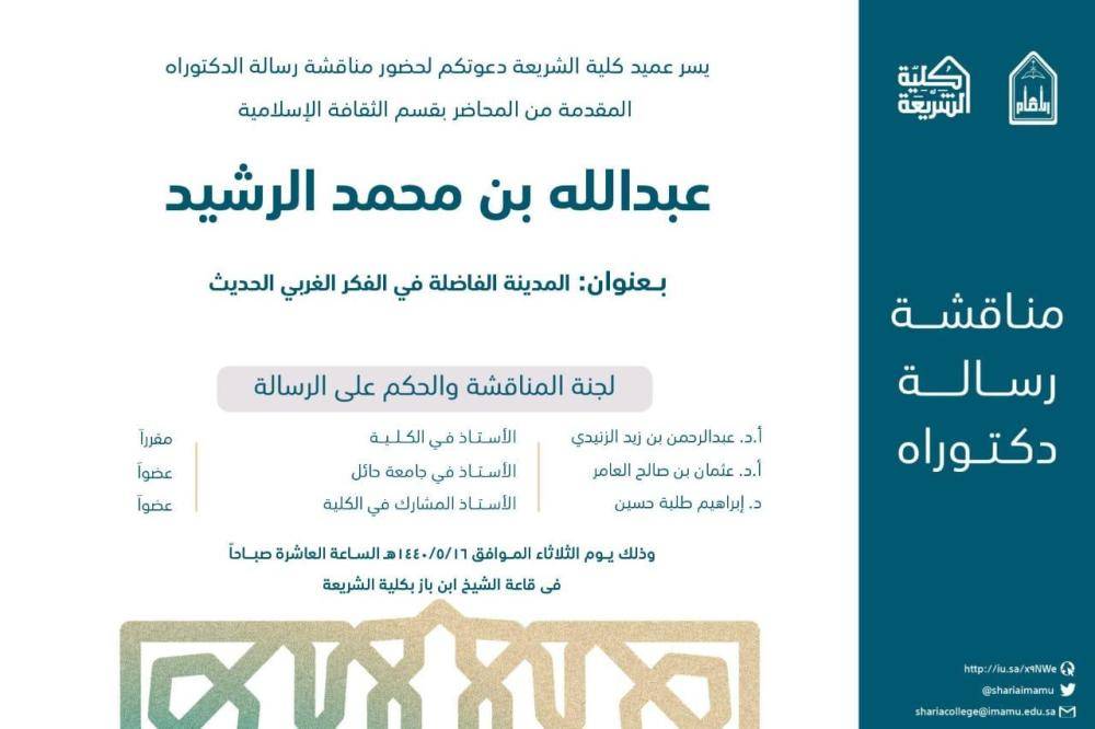 حصل الزميل عبدالله الرشيد على درجة الدكتوراه من كلية الشريعة بجامعة الإمام محمد بن سعود الإسلامية، بتقدير (ممتاز) مع مرتبة الشرف الأولى، والتوصية بطباعة الرسالة وتبادلها مع الجامعات العالمية، وذلك في رسالته التي حملت عنوان «المدينة الفاضلة في الفكر الغربي الحديث - دراسة تحليلية نقدية».
