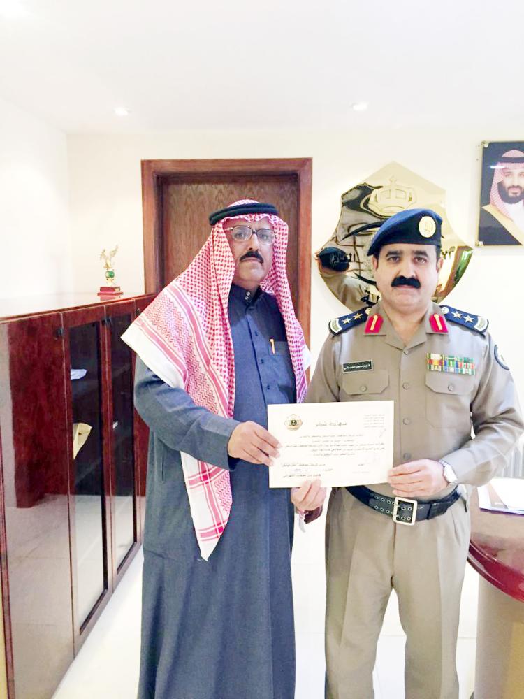 العقيد الشهراني يسلم الشمري شهادة الشكر والتقدير.