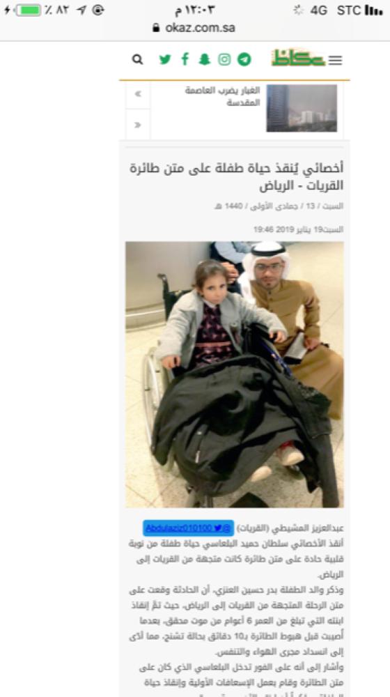 وتفصيلاً نشرت صحيفة «عكاظ» الخبر قبل نحو أسبوع والذي وذكر والد الطفلة بدر حسين العنزي، أن الحادثة وقعت على متن الرحلة المتجهة من القريات إلى الرياض، حيث تمَّ إنقاذ ابنته التي تبلغ من العمر 6 أعوام من موت محقق، بعدما أُصيبت قبل هبوط الطائرة بـ10 دقائق بحالة تشنج، مما أدّى إلى انسداد مجرى الهواء والتنفس.
