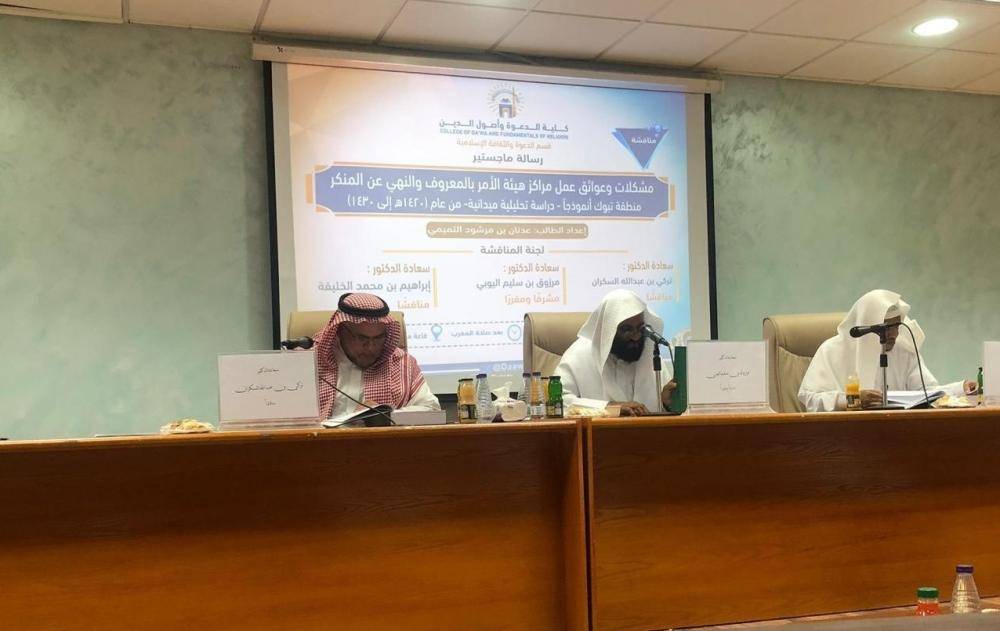 حصل الشيخ عدنان مرشود التميمي، إمام مسجد بر الوالدين وخطيب جامع أبي بكر الصديق رضي الله عنه بالمدينة المنورة، على شهادة الماجستير، من «كلية الدعوة وأصول الدين بالجامعة الإسلامية بالمدينة المنورة»، بتقدير ممتاز مع مرتبة الشرف الأولى، وكان عنوان الرسالة: (مشكلات وعوائق عمل مراكز هيئة الأمر بالمعروف والنهي عن المنكر منطقة تبوك أنموذجا) دراسة تحليلية ميدانية.
