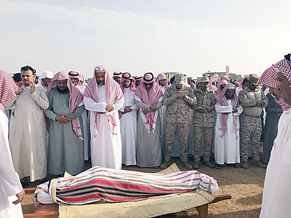 وتقدم المصلين على الشهيد في جامع القرية محافظ الطوال رزاح بن حبيش الدوسري، والمستشار في محكمة الاستئناف القاضي علي شيبان العامري.