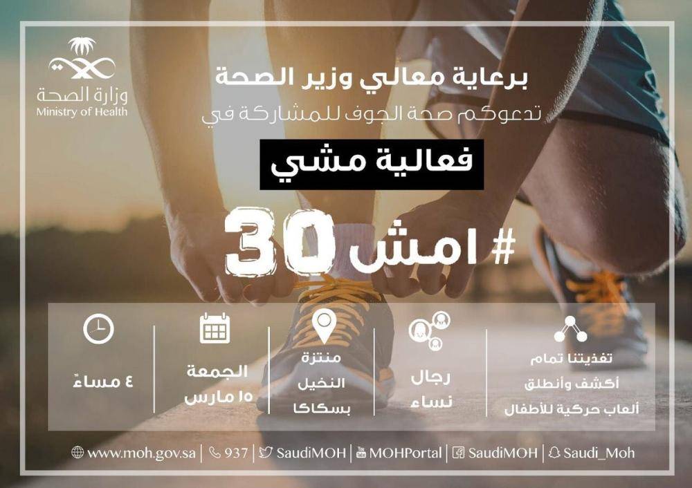 برعاية وزير الصحة الدكتور توفيق الربيعة تنظم المديرية العامة للشئون الصحية بمنطقة الجوف فعالية مشي (الجمعة) المقبل، ضمن الحملة التوعوية للمشي التي ستطلقها الصحة في جميع مناطق ومحافظات المملكة وذلك تحت شعار (#امش30).