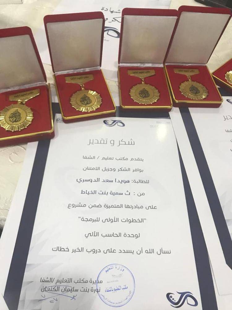 واختتم الملتقى بالتكريم للداعمين والمشاركين والمتميزين في المشاريع وفي مسابقة المعمل المثالي للحاسب الآليتين، حصلت متوسطة أم أيمن على المركز الاول ومتوسطة حفصة بنت عمر على المركز الثاني على مستوى مكتب الشفا، وتجول الحاضرون في المعرض المصاحب للملتقى والذي يحتوي على مشاريع متنوعة للطالبات بفروع تقنية (برمجة وتصميم ومونتاج ) (ومشاريع المايكروبت للموهوبات والمواطنه الرقميه للحاسب ) وقد استمتع الحضور بشرح الطالبات للمشاريع.