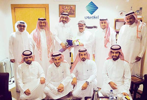 الكنهل محاطا بأعضاء جمعية إعلاميون. (عكاظ)