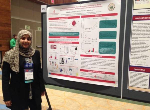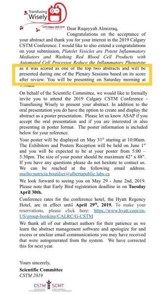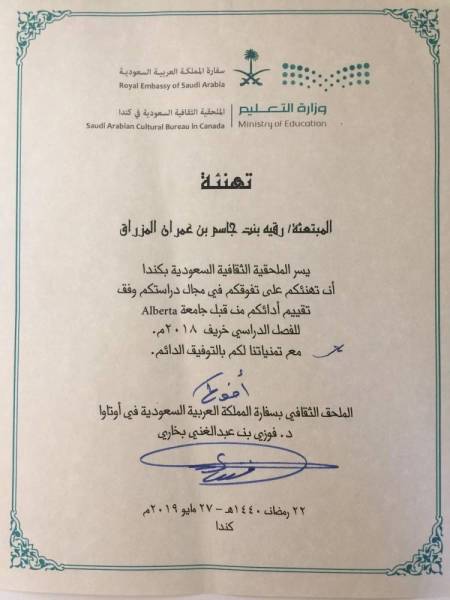 صنف ملخص بحث المبتعثة السعودية في جامعة البرتا بكندا الدكتورة رقية جاسم المزراق ضمن أفضل بحثين لعام 2019، بحيث قامت بإلقائه في مؤتمر الجمعية لطب نقل الدم CSTM 2019، وقالت الدكتورة المزراق (الحاصلة على درجه الدكتوراة الفلسفية بامتياز)، أنها حصلت على جائزة أفضل عارض بحث، حيث كانت الفتاة العربية المسلمة الوحيدة في المؤتمر العلمي العالمي Society of Cryobiology ضمن أفضل البحوث، مضيفة أنها حصلت على جائزة التميز في القيادة و التعليم والخدمات الطلابية من قسم علوم المختبرات الطبية والأمراض في جامعه البرتا.