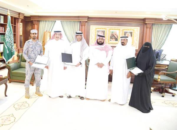 أمير جازان ونائبه مع المكرمين. (عكاظ)