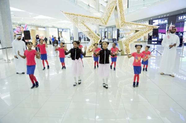 فرقة أطفال تقدم استعراضا لمتسوقين في مركز تجاري بجدة.