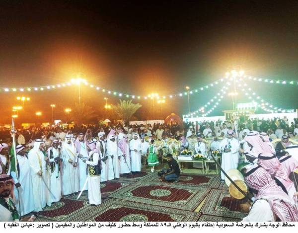 وبعد أن تجول التميمي في المعرض المصاحب للاحتفالات، الذي شاركت به الكلية الجامعية بالوجه مع عدد من الدوائر الحكومية، بدأ الحفل الخطابي الذي تضمن كلمة للأهالي، ألقاها نيابة عنهم رئيس المجلس البلدي أحمد بن محمود الشريف، وعددا من القصائد الشعرية، إضافة إلى مشاركة فرقة من البراعم الصغار تغنوا فيها بأمجاد الوطن. كما شارك محافظ الوجه مع عدد من أبناء المحافظة في العرضة السعودية التي اختتم بها الحفل.