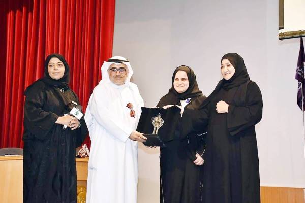 وسلمت مديرة الجامعة الدكتورة سهير القرشي الدرع لمدير عام قنوات اقرأ الفضائية محمد سلام.