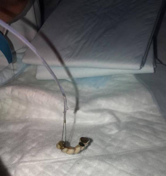 وكان المريض يعاني من آلام في البطن، وبعد عمل الأشعة اتضح وجود طقم الأسنان في المعدة، وعلى الفور تم عمل منظار علوي للمعدة، وإستخراج الطقم بإستخدام حلقة معدنية للإمساك به.