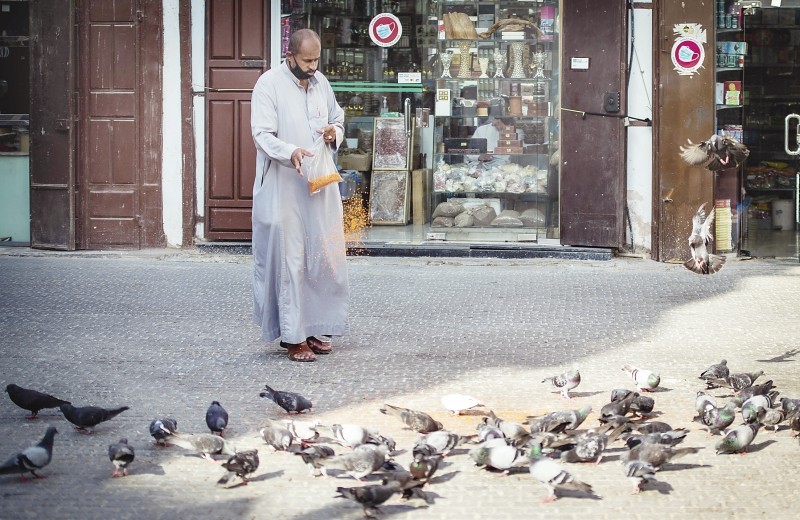 رجل يطعم الحمام في المنطقة التاريخية في جدة.