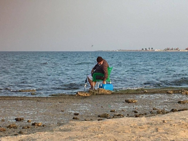عبدالمحسن الحمادة يهوى صيد السمك على ضفاف الخليج العربي بشاطئ العقير في الأحساء.