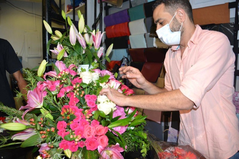 بائع يعد باقة ورد في أحد المحلات التجارية في جدة.