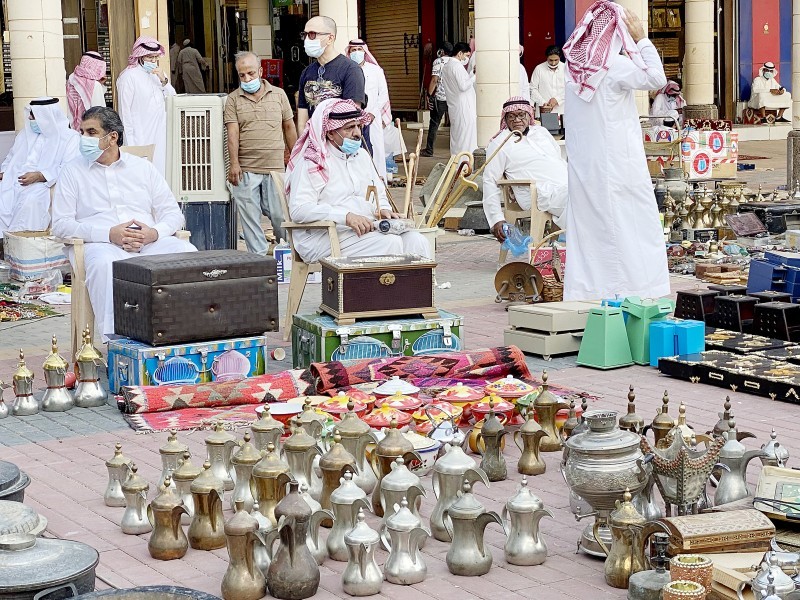 بائعون يستعرضون دلال قهوة قديمة في سوق الزل في الرياض.