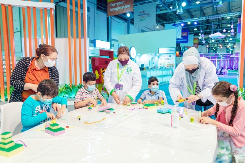 أطفال يصنعون أشكالاً مختلفة بالإسفنج والورق، في مهرجان الشارقة القرائي للطفل أمس.