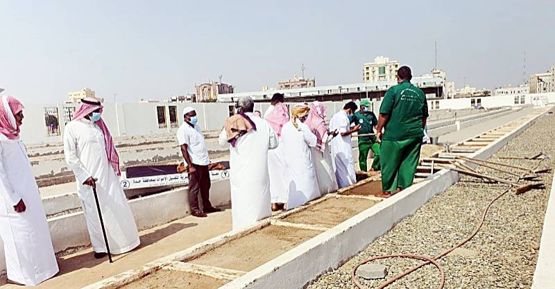 أثناء تشييع جثمان الفقيد في مقبرة الفيصلية أمس. (عكاظ)