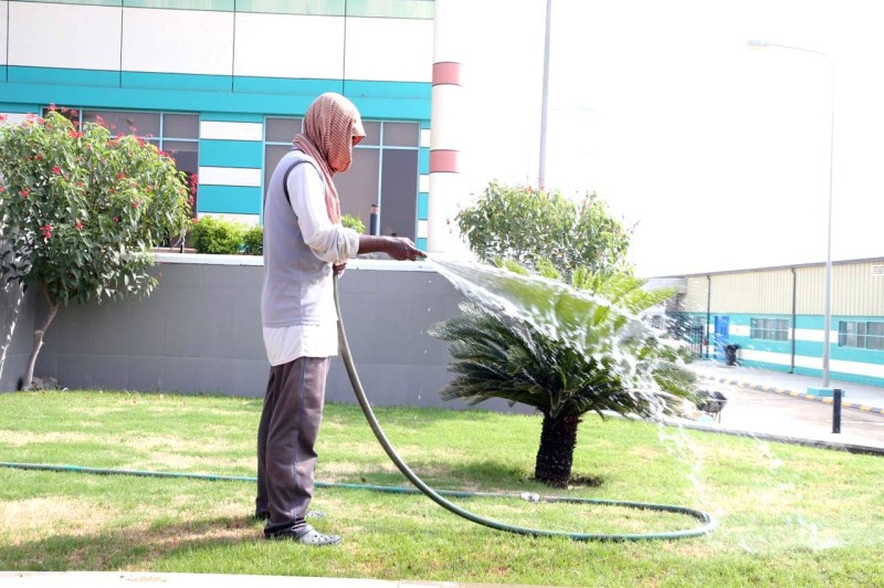 عامل يسقي الزرع في المعهد السعودي الياباني بجدة أمس. (تصوير: مديني عسيري)