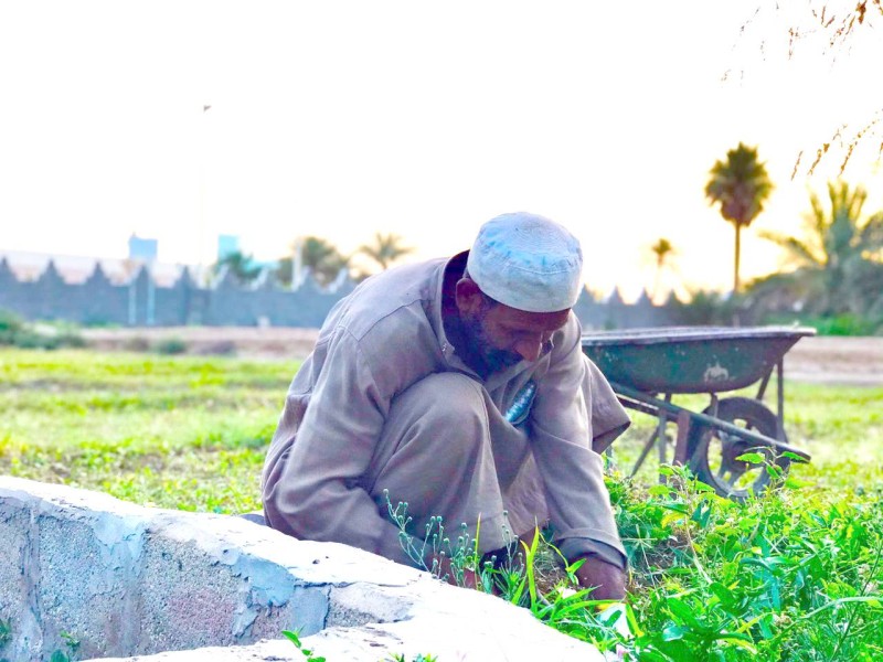 مزارع يحصد أحد المنتجات وسط محافظة عنيزة، مع نسمات الصباح والتي تشهد اعتدالا في الأجواء. (تصوير: إبراهيم شمسان)
