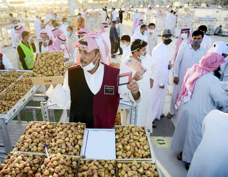 شاب يستعرض التمر السكري في مهرجان بريدة للتمور الذي ينطلق اليوم (الأحد).