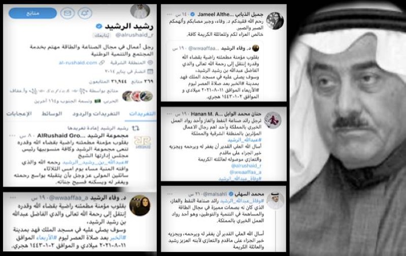 أما مدير الإعلام بإمارة الشرقية محمد السهلي، فأوضح أن عبدالله الرشيد‬⁩ رائد صناعة النفط والغاز، كانت له بصمات مميزة في مجال الطاقة والمساهمة في التنمية والتوطين، وهو أحد رواد العمل الخيري بالمملكة. وقال السهلي: «أسأل الله العلي القدير أن يغفر له ويرحمه، ويجزيه خير الجزاء على ما قدم، والتعازي لابنه العزيز رشيد والعائلة الكريمة».