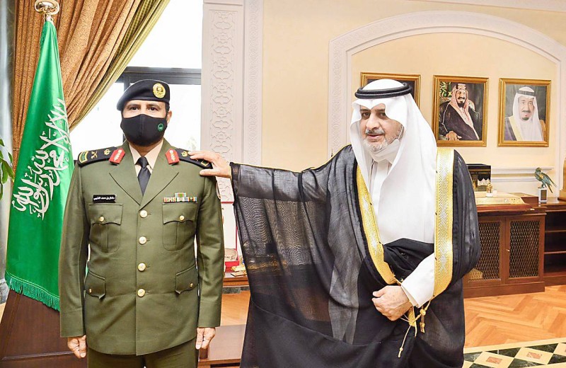 الأمير فهد بن سلطان مقلدا العتيبي رتبته الجديدة. (عكاظ)