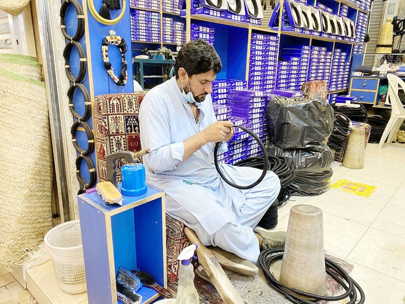 عامل يقوم بتصليح العقل في سوق الزل بالرياض.