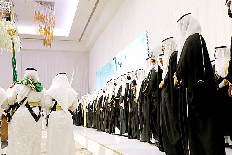 العرسان في صورة جماعية خلال حفلة الزفاف. (عكاظ)