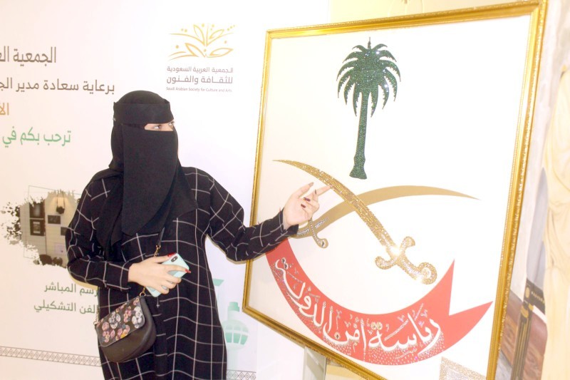الفنانة شوق الشاذلي تستعرض لوحة لرئاسة أمن الدولة تزينها أكثر من 3 آلاف قطعة من الكريستال في تبوك. (تصوير: علي بدير)