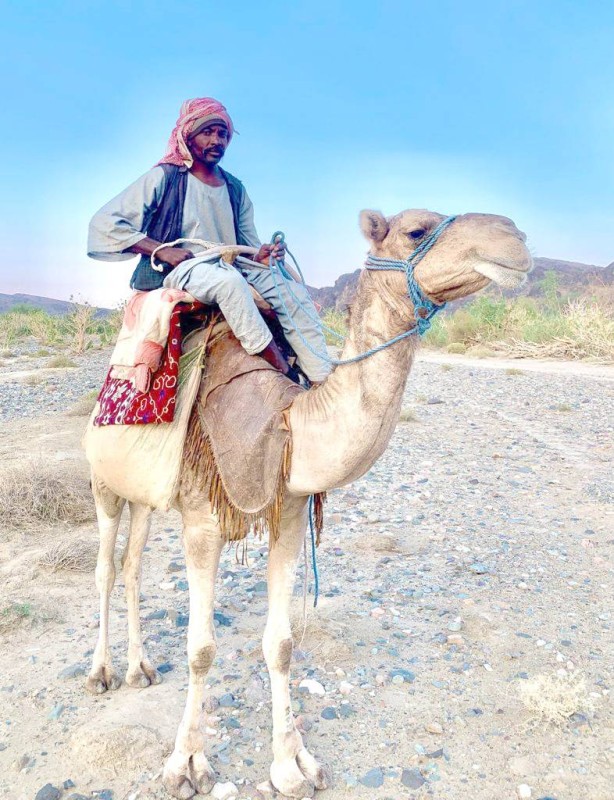 راعي إبل يمتطي راحلته في أحد الأودية غرب محافظة بيشة. (تصوير: إبراهيم الأكلبي)