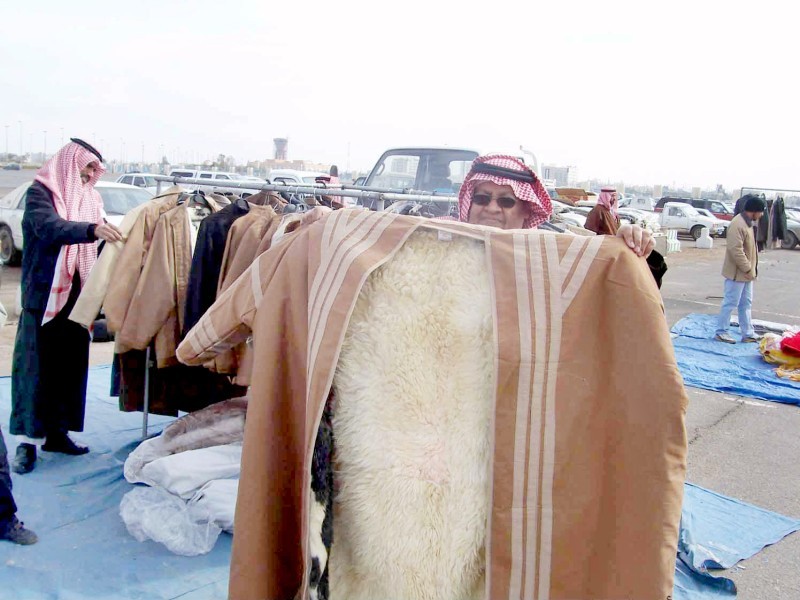 بائع يستعرض الفروة، رداء فصل الشتاء في تبوك، أمس.