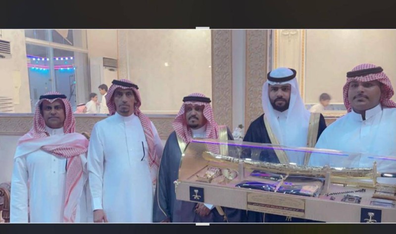 العريس مع والده وبعض المهنئين. (عكاظ)
