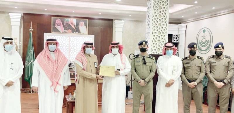 المورقي مكرماً أحد المتطوعين. (عكاظ)