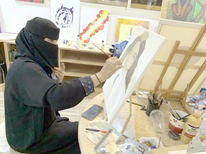 الفنانة التشكيلية أماني الحويطي تضع اللمسات الأخيرة على لوحتها استعدادا للمشاركة في أحد المعارض بتبوك. (تصوير: علي بدير)