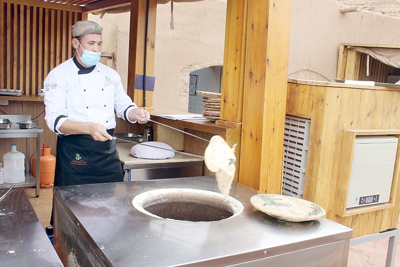 عامل يعد خبز التنور استعدادا لتقديمه للسياح في البلدة القديمة بالعلا.