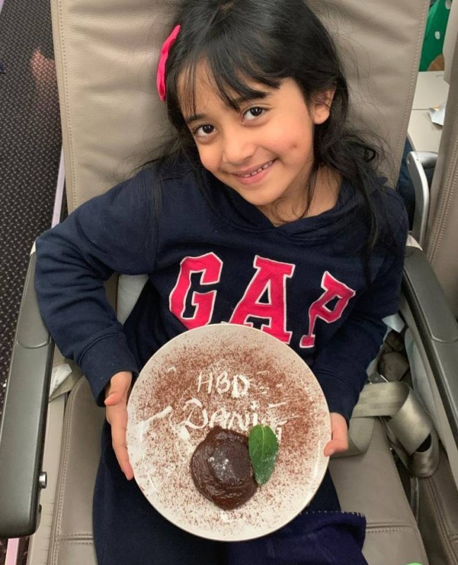 الطفلة دانية مع طبق الحلوى محتفلة بالذكرى السادسة لميلادها في الطائرة