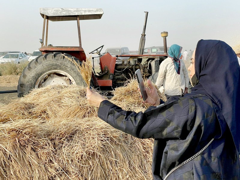 سيدة تلتقط صورة لسنابل الأرز الحساوي في إحدى المزارع بالأحساء.