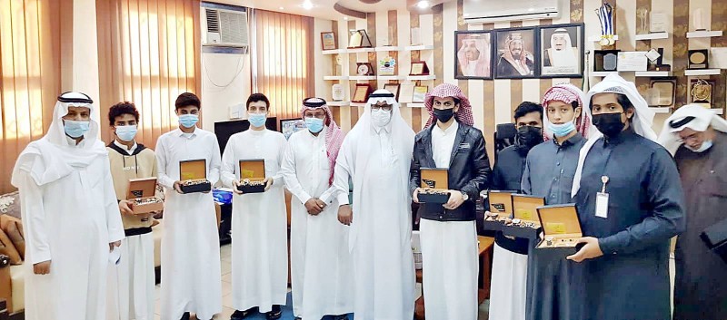 المكرمون مع مدير المدرسة في الاحتفالية.(عكاظ)