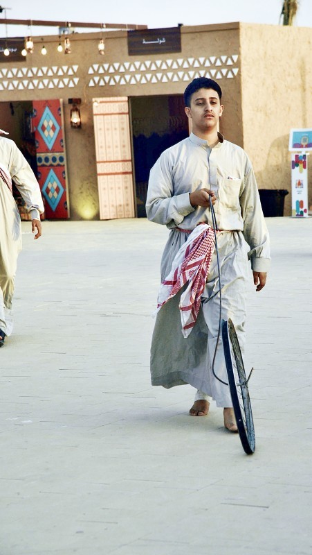 شاب يستعرض لعبة الدنانة في قرية زمان بموسم الرياض.