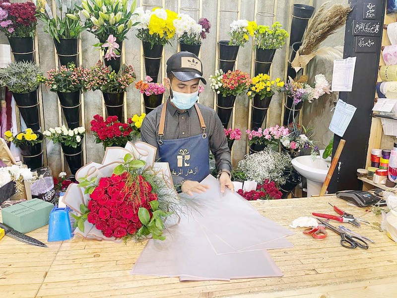 في «يوم الحب» غمرت الورود الحمراء متاجر الهدايا.. وفي الصورة بائع زهور في جدة يُعد باقة من الشذى والعطر.
