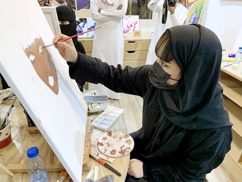 الفنانة التشكيلية جواهر البدر تمارس الرسم في صالون جمعية الثقافة والفنون بتبوك.