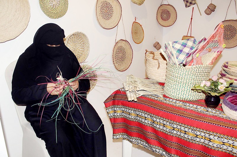 سيدة تمارس صناعة السلال من خوص النخيل في متحف القلعة بتبوك.