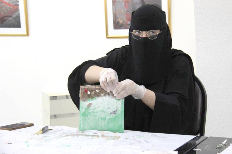 المدربة فاطمة الدهلوي تستعرض فن الريزن في ورشة عمل بجمعية الثقافة والفنون بتبوك. (عكاظ)
