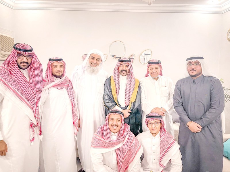 العريس محاطاً ببعض الأقارب. (عكاظ)