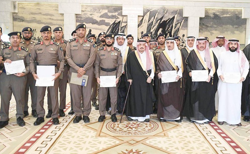 الأمير فيصل بن بندر متوسطاً المشاركين عقب تكريمهم.(واس)