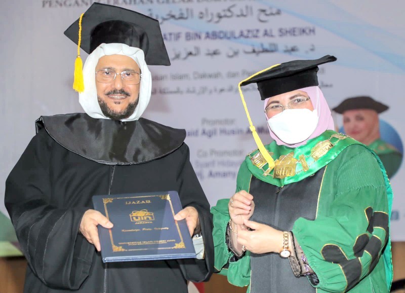 منحت جامعة شريف هداية الله الإسلامية الحكومية بجمهورية إندونيسيا وزير الشؤون الإسلامية والدعوة والإرشاد الشيخ الدكتور عبداللطيف بن عبدالعزيز آل الشيخ الدكتوراه الفخرية في العلوم الشرعية أمس (الإثنين)، كأول شخصية إسلامية على مستوى العالم تتشرف الجامعة بمنحها، تزامنًا مع الزيارة الرسمية التي يقوم بها حالياً لجمهورية إندونيسيا.